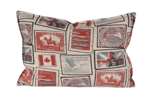 L626-STMP 14"x20" Vintage Stamp Images printed on this Pillow reverse to solid Coordinate with Feather Insert and Flanged edge part of The Vintage Canadiana Collection